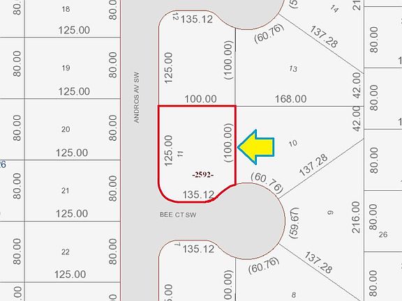 This oversized 0.27 acre residential lot is available in Port Malabar Unit 49 of Palm Bay. Located in the southwest section, it is just 1,7 miles - 5 minutes to Westside Elementary School, 3.5 miles - 9 minutes to the Publix Supermarket, 14.7 miles - 35 minutes to Melbourne Airport, and 20.7 miles - 41 minutes to the beaches of Indialantic. From exit #176 of I-95, go west on Palm Bay Road for .7 miles, left on Minton Road for 3.4 miles, right on Jupiter Boulevard, quick left on DeGroodt Road for 2.5 miles, right on JA Bombardier Boulevard for .9 miles, left on Madden Avenue for .9 miles, right on Wisham Street for .1 mile, and left on Andros Avenue. The lot will be on your left on the northeast corner with Bee Court.
