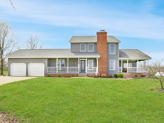 Serene rolling hills and lake views abound in this freshly painted 4 bed/3.5 bath 3,488 sf home on 7.1 acres in Castle school district. Minutes from Newburgh and Boonville.  Front room with woodburning fireplace insert, glass doors to 2 of the 3 covered porches connects to massive kitchen with custom hickory cabinetry, pull-outs, soft-close, under cabinet lighting. Quartz countertops emphasize the large island, plus bar top and bench for additional seating. Large walk-in pantry. Recently carpeted great room, vaulted ceiling, spiral staircase leading to the ICF concrete basement and large additional bedroom with its own exterior door and full bath.  Woodburning fireplace in master bedroom, heated whirlpool tub, shower, custom wood cabinetry and walk-in closet complete the ensuite. Firepit, NEW Presby Septic System, recent Hi-Efficiency (90+) furnace, hot water heater and roof add to the long list of updates. 5,800 sf shop- 6 garage doors for RV storage of all sizes, woodburning stoves, office, half bath, loft storage. 13’6” ceilings, overhead hoist for projects, equipment.