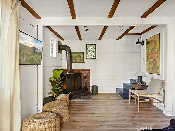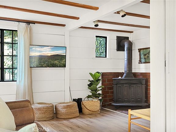 Fifty three stairs lead up to the home, nestled high above the street amongst the cedars, pines and dogwoods. A welcoming front porch beckons you to sit down, slow down and breathe in the crisp mountain air. The entry level features a living room with cozy wood burning stove, dining area, kitchen and full bathroom. The kitchen opens onto the back patio - the perfect spot to enjoy s'mores around the fire. Upstairs are two intimate bedrooms. This home is offered furnished and has been tastefully curated to compliment the vintage feel of the cabin, whilst not compromising on modern day comfort and style. Successful short term rental history. Located within one mile from Lake Gregory and Lake Gregory Village. You will love the peaceful setting of this darling cabin.