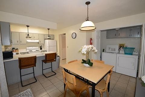 INSIDE: Fresh paint, new windows, updated bathrooms, new furnace and AC, new Refrigerator and dishwasher. No carpet, tiled throughout and wood staircase. 2 huge bedrooms measuring 14 x 14. Each with 2 closets. Closeted washer and dryer area.