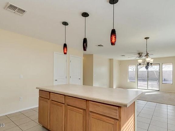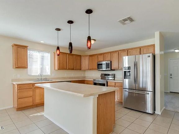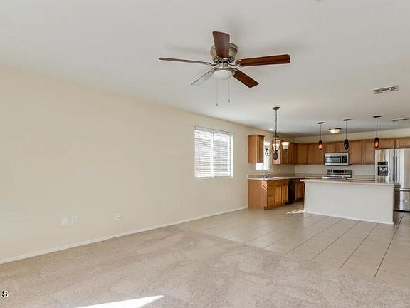 Beautiful 3 bedroom/ 2 bathroom home with two-car garage in Casa Grande. This single level home features two-tone paint, ceiling fans, and carpet. The spacious kitchen comes complete with stainless steel appliances including a new refrigerator, a center island with breakfast bar, upgraded lighting fixtures, and pantry. The primary bedroom is large, with bathroom upgraded countertops plus a walk-in closet. Step outside to a covered patio and easy care desert landscaping.