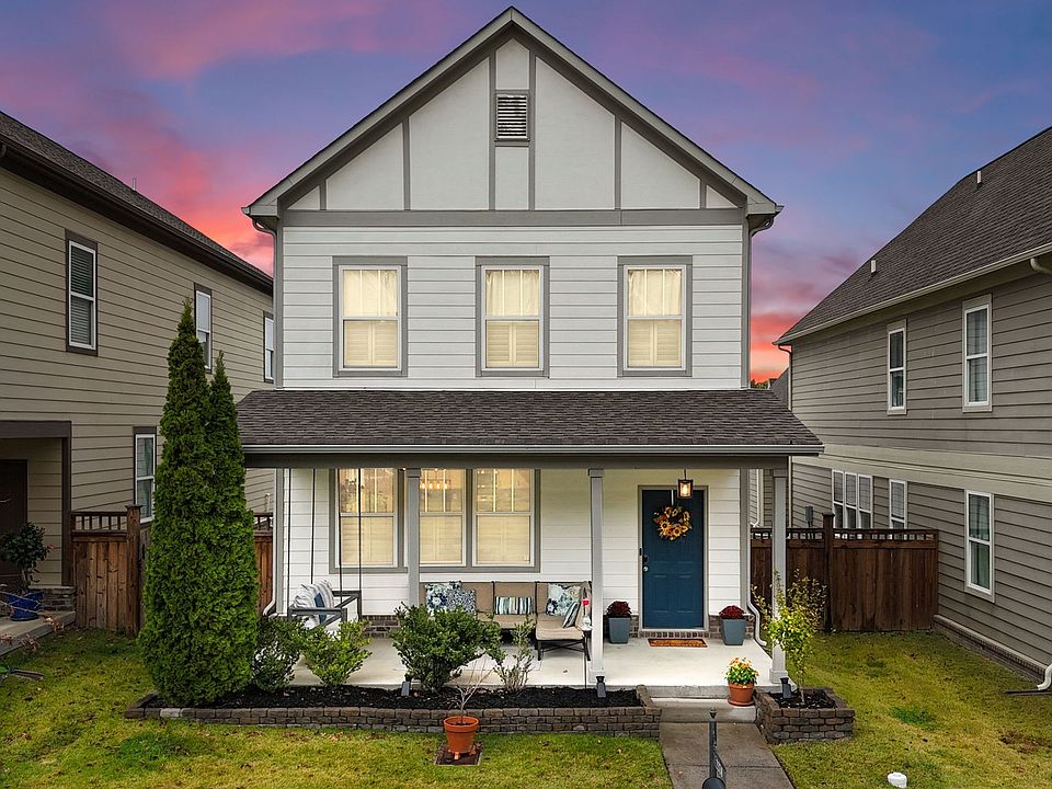Welcome to Cambridge Park, a highly desirable neighborhood with only 77 homes! This delightful home features a thoughtfully designed layout with ample space. Before you step inside, take a moment to relax on the covered front porch equipped with a built-in swing. The main floor features gorgeous hardwood flooring that flows into a spacious living room, which connects effortlessly to the kitchen, making it ideal for hosting gatherings. The kitchen comes with upgraded cabinets, granite countertops, a tile backsplash, an island, stainless steel appliances, and a charming breakfast nook. There's also a sunroom that can function as a playroom or office, providing access to the backyard and a door that leads to the two-car rear-entry garage. For your convenience, a half bathroom and laundry is located on the main level. This stunning home has been enhanced with built-in plantation shutters, new lighting fixtures throughout, crown molding, and ample storage in closets with built-in shelving. Upstairs, you'll discover the primary suite, which includes a spacious walk-in closet, a tiled shower, and a double vanity. This level also features two additional bedrooms and a full bathroom. Step outside to the patio and enjoy the extended area with a sitting space, grilling area, and plenty of green space, perfect for relaxation and privacy within your fenced yard. The community offers beautiful green spaces, ample open areas, and sidewalks. The charming Cambridge Park community is conveniently situated just a 10-15 minute drive from Brentwood, Cane Ridge Park, and Lenox Village, with easy access to the interstate and nearby shopping and dining options. Don't miss the opportunity to make this wonderful place your home.