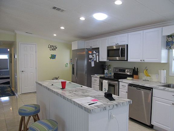 Manufactured home in sought after 55+ community of Harbor Isles. Pet friendly. 2 Bedrooms 2 baths completely renovated home with open concept living. This home has been lovingly updated with new kitchen, appliances, air-conditioned, roof, windows, tile flooring throughout, new tiled bathrooms, ship lap and granite in family room and crown molding throughout A Must See home