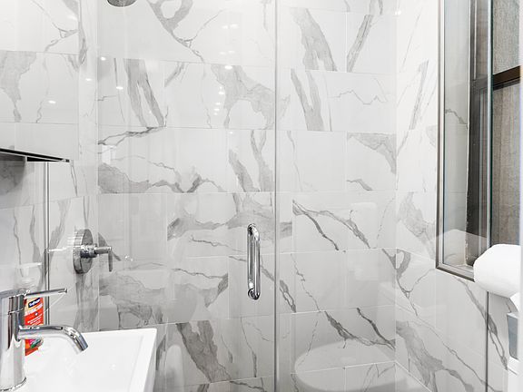 Stylish, full-tiled bathroom with a walk-in shower stall