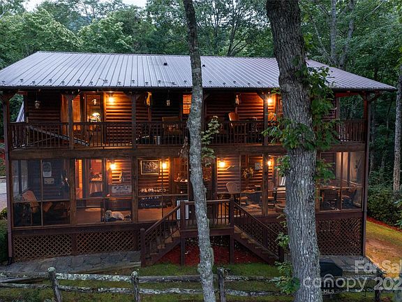 At the edge of Pisgah National Forest, this almost 3200 ft elevation luxury mountain retreat with its private waterfall and creek is a breathtaking oasis. Warmth and sophistication abound. With vaulted, exposed beam ceilings that feature a great room stone fireplace, a spacious custom kitchen with a large island, and high-end appliances, this home is perfect for family and entertaining. Retreat to the primary suite with its access to a screened porch and spa-like bathroom with a soaking tub and walk-in shower. Upstairs, two large bedrooms and a bathroom share a covered deck with scenic mountain views. A large garage can double as a workout space and easily accommodate ATVs, fishing, and golf equipment. This living work of art is a HOME where every turn tells a story of nature and craftsmanship. Enjoy the fire pit and grill outside, cozy up inside, and fall asleep to the gentle melodies of the waterfall and creek. This is where luxury and wilderness blend for idyllic mountain living.