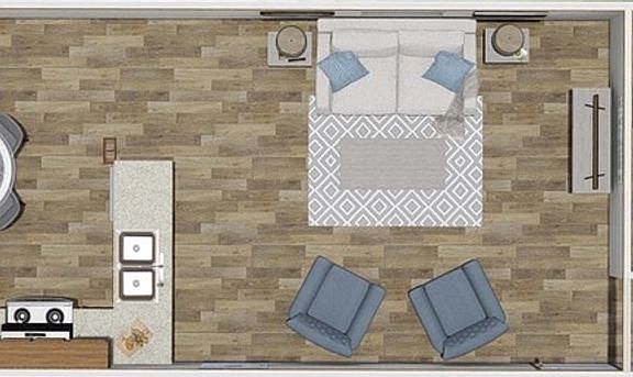 Open floor planWalk-in closetFront and back deckShelving for storage