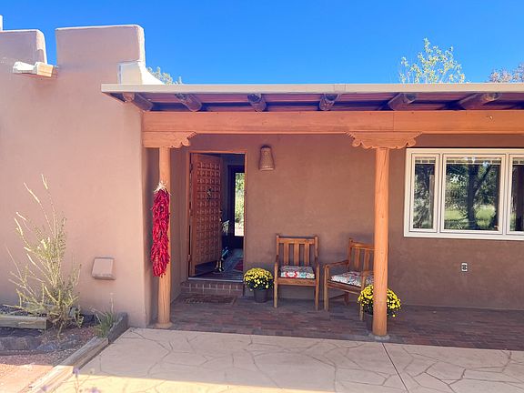 Tucked away in the serenity of Pajarito Acres, this captivating home celebrates the timeless character of traditional Santa Fe architecture. Natural vigas and latilla ceilings, gleaming red brick floors, and streams of natural light create a warm, inviting atmosphere throughout, enhanced by three distinctive fireplaces. The first living room opens at the back to expansive glass doors that frame the gardens and lead to a covered patio, offering a seamless extension of the living space into the outdoors. The generous kitchen, equipped with a prep island, gas cooktop, and stainless steel appliances, flows gracefully into the dining room, where a charming fireplace sets a welcoming tone. The primary suite provides a true retreat, complete with a sitting area, walk-in closet, and a private deck ideal for savoring morning coffee or evening skies. The luxurious bath is spa-inspired, featuring a steam shower, jetted tub, dual vanity, and large skylights that flood the space with natural light. Two additional bedrooms add versatility - one with its own en suite half bath, the other with private porch access. The flexible laundry room doubles as a bonus space for hobbies, crafts, or quiet relaxation. A second living area with a classic kiva fireplace offers another comfortable gathering space or can serve as a fourth bedroom. Set on three acres of masterfully landscaped grounds, the property combines beauty with purpose, offering an oversized garage, a four-stall barn, and a skillion shed ideal for gardening or storage. With four mini-split air conditioning units for individualized comfort, this residence blends Southwestern elegance with modern convenience, creating a sanctuary of style, warmth, and tranquility.