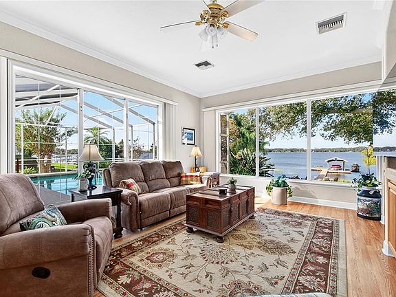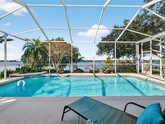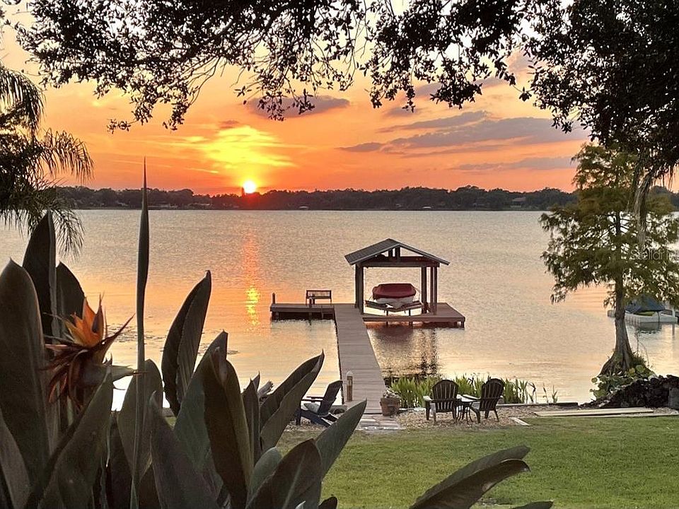 Nestled in the charming, gated community of Ruby Lake, this beautiful 4-bedroom, 3-bath pool home provides the perfect blend of elegance and comfort. Known for being two of the most sought-after lakes for water skiing and fishing, Ruby Lake and Lake Bess are connected by a canal allowing for plenty of space for all water activities. Perched on gentle elevation, this property boasts breathtaking sunsets and lush scenery, while also offering some of the best views in this quaint and walkable neighborhood. The elegant entryway leads to the formal living and dining area, with spectacular views of the pool and lake. High ceilings throughout the home, enter the open-concept kitchen, breakfast area, and family room that also showcase the incredible views through an abundance of windows. The spacious kitchen features plenty of cabinets, solid surface countertops, a generously sized closet pantry, and a welcoming layout, making it easy for everyone to participate in gatherings. The Main Bedroom serves as a private retreat offering the same stunning pool and lake views, featuring high ceilings, two walk-in closets, and a luxurious en-suite bath with a shower, tub, and dual vanities. A true split floor plan featuring spacious and inviting 2nd and 3rd bedrooms, with generously sized closets, wonderful views and a nicely appointed guest bath in between each. The 4th bedroom is currently being used as an office and is conveniently located near the full pool bath allowing privacy for the whole family and guests. The backyard is a true oasis, boasting a screened-in pool, an outdoor kitchen added in 2016, a relaxing sandy beach area, lush gardens, a dock with a boat lift built in 2020, and irrigation conveniently sourced from the lake. The dock also features a cozy sitting area, perfect for enjoying sunsets or catching the Legoland fireworks. Both the front and back yards create a tropical paradise, filled with majestic Palms, Oaks, Crepe Myrtles, and exotic plants that provide a park-like setting, reduce energy costs, and enhance the serene beauty. Park the car, step into the kitchen from the oversized two-car garage and enjoy the convenience of a spacious laundry room with storage just steps away. The large driveway offers plenty of space for family and guest parking. Relax with peace of mind knowing the roof was updated in 2022, the HVAC in 2020, and the water heater is newer. Enjoy this wonderful community and its proximity to all things Central Florida to include nearby theme parks, the Winter Haven Chain of Lakes, known as the "Water Ski Capital of the World", local shopping and restaurants and nearby beaches. Come home to this truly delightful and serene retreat—call today to schedule your private showing!