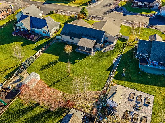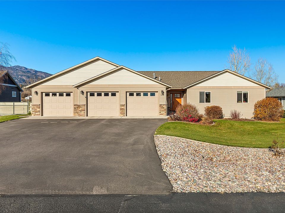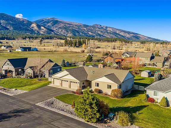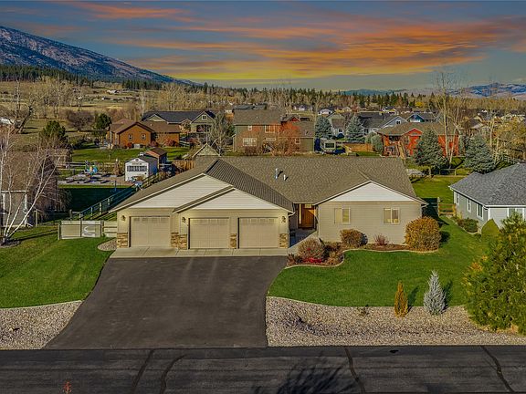 Welcome to Mountain Meadows in Florence, Montana! A beautifully established neighborhood with sweeping mountain views and generous common green spaces. Tucked away near the end of a quiet dead-end street is a single-level, 3-bedroom, 2 bathroom, zero-entry home that sits on nearly half an acre with landscaped grounds, fully fenced backyard, offering both privacy and room to breathe. From the moment you step inside, the open floor plan and vaulted ceilings create an immediate sense of light, space and warmth. The living room, dining area, and into a spacious kitchen offer a functional flow and are designed for both everyday ease and effortless entertaining. The kitchen serves as the heart of the home, featuring stunning stone leathered granite countertops that harmonize effortlessly with the plentiful warm wood cabinetry. The ensemble is enhanced by newer appliances and contemporary light fixtures, including a stainless-steel refrigerator, built-in wall oven and microwave, a gas five-burner cooktop, and a Bosch dishwasher. A sliding door seamlessly connects the interior to the covered back deck offering a view of mature landscaping and snowcapped mountain peaks. The primary suite offers an ensuite bathroom complete with stone countertops, a dual-sink vanity, a dedicated sitting makeup area, and a walk-in closet. Additionally, there are two spacious guest bedrooms and a guest bathroom featuring a stone countertop and a linen tower. The laundry and mudroom area, are conveniently located off the attached oversized three-car garage, helping keep daily life organized. Throughout the home, solid wood doors contribute a touch of timeless craftsmanship to every space.