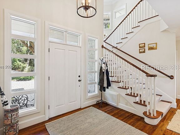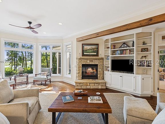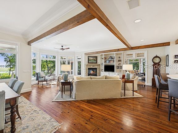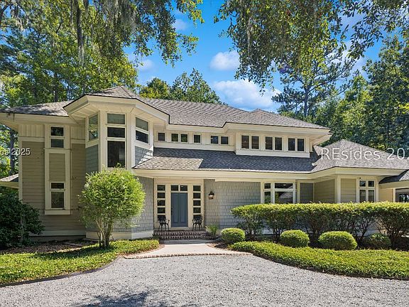 Designed by Lee and Parker Architects and masterfully built in 2001, this exceptional 3-bedroom, 4-bath residence offers 3,987 square feet of refined Lowcountry living. Perfectly sited on 2.28 acres overlooking the Chechessee River and surrounding marshlands, the home captures the natural beauty of its setting from every angle. Expansive windows fill the interiors with golden light and sweeping views of the tidal landscape, creating a seamless connection between indoors and out. The thoughtfully designed floor plan offers gracious living and entertaining spaces, including a welcoming living area with a fireplace and a luxurious primary suite featuring its own private fireplace-ideal for cozy evenings. Step outside to a spacious back patio that overlooks the picturesque marsh, perfect for dining or quiet moments surrounded by nature. A second-story balcony provides an elevated vantage point to take in the breathtaking scenery and offers the morning sunrise. A detached two-car garage with an additional golf cart bay adds convenience and versatility. This architecturally distinctive property combines timeless craftsmanship with serene coastal beauty, offering the perfect retreat where elegance meets the essence of Lowcountry living.
