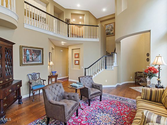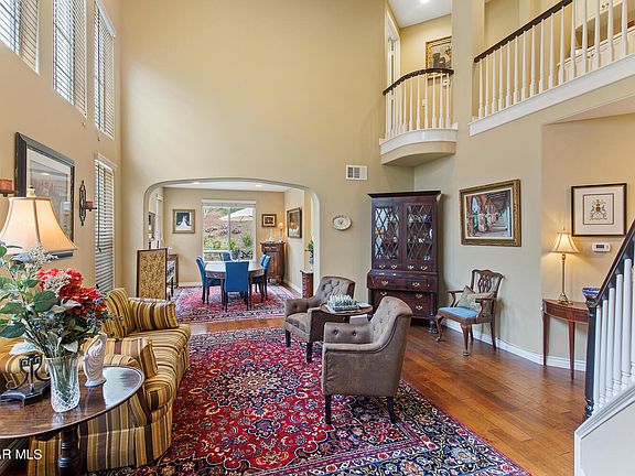 Fabulous property in an ideal location in Dos Vientos Ranch! Located on a cul-de-sac and backing to Open Space with pretty views and privacy out back. Sparkling pool and spa newly built. This gorgeous upgraded home is in pristine condition. Cielo Real's popular Plan 2 features 5 bedrooms, 4 baths, homework station and 3,143 sq ft. Pretty entry with new stamped concrete hardscapes, new exterior paints, new garage doors, and new landscapes. Enter to soaring ceilings, mountain views, new paints and carpets, and gorgeous wood floors. Open kitchen with white cabinets, granite counters, new appliances, pantry, and breakfast nook with built-in desk/work area. Out back is such a private location with hilltop views, gorgeous new landscapes and lawn, and sparkling salt water pool and spa just in time for summer! Sitting deck up top enjoys sunset and Boney Mountain views. Floor plan features one bedroom/bath downstairs, three plus the primary upstairs, as well as laundry, and homework station. Tasteful upgrades in all the bathrooms. Primary bathroom has total privacy, pretty views, dual sink stations, two spacious walk in closets and upgraded shower. Very popular floor plan with a great bedroom/bath count and a full 3 car garage with added storage. Located a short block to Sycamore Canyon K-8 School, numerous parks, hiking trails, and The Village at Dos Vientos Ranch.