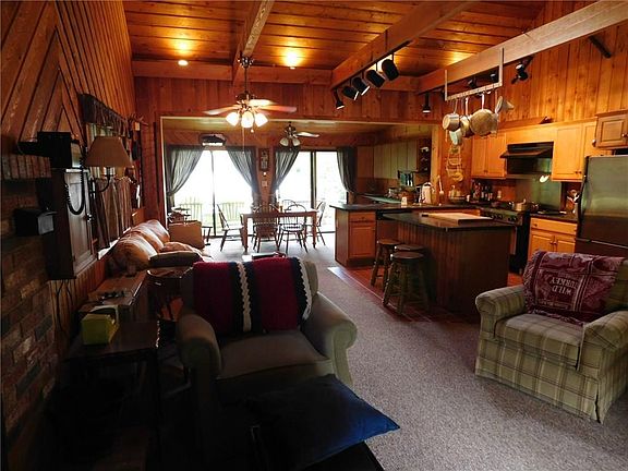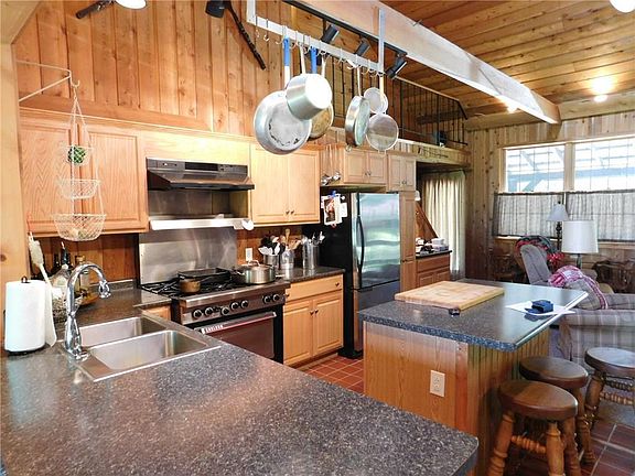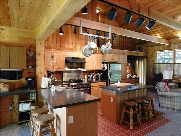 4BR 2BA year-round camp on Beautiful Portage Lake. Open beam cathedral ceiling. Gourmet kitchen with 2 bars, 6 burner Garland gas stove and stainless steel appliances. Double glass door to deck overlooking lake with pier to water.