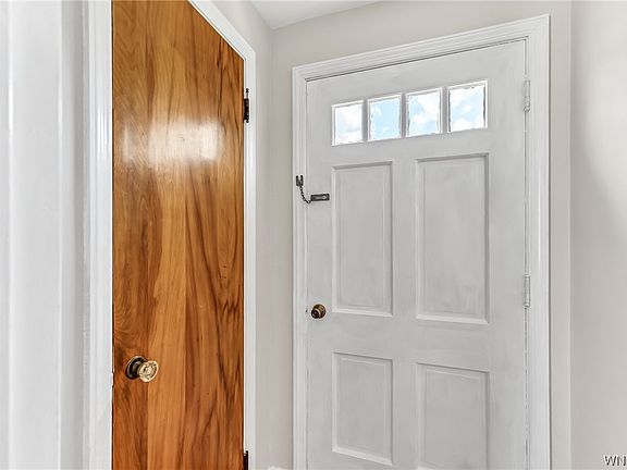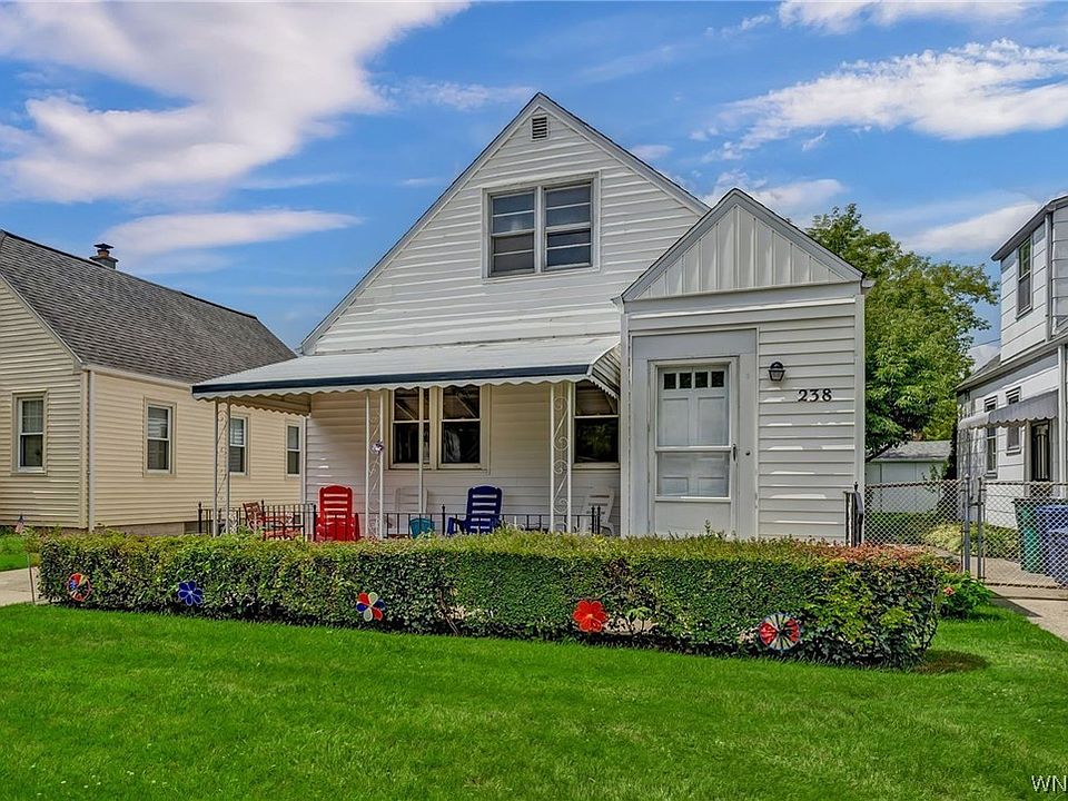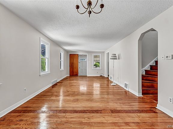 2/1 Mortgage Interest rate buydown available. First year mortgage rate 5.25-5.5%. Incredibly bright, open living spaces in a North Buffalo bungalow. Roof is young, exterior is no maintenance white vinyl and there is a wonderful covered patio. Deep, wide treed yard. Epic living room opens to dining room, flawless walls, ceilings, new windows and classic, original oak hardwood floors. Kitchen abundant with high quality wood cabinets and appliances. Secluded first floor bedroom with walk in closet. Black and white tiled bathroom and a first floor laundry room. Three bedroom are big, with great closets and storage. Clean, dry basement with drain tile, modern and updated heating and hot water systems, glass block windows and central air. Area on tax record was incorrect. Area was measured and corrected.