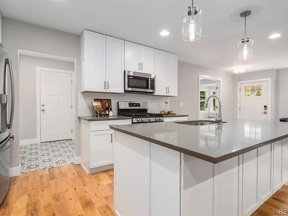 Welcome to your fully updated, ranch-style, home on a quiet street in the highly desirable Morse Park! As you enter this clean and sleek home, you will instantly be greeted by the spacious layout and open feel of the home. The expansive kitchen opens directly to the dining area and living room. Enjoy sleek white cabinets with grey quartz solid slab counter tops and newer stainless-steel appliances. Ample cabinet storage throughout including under the kitchen island. Adjacent to the kitchen is a large walk-in pantry perfect for storing your special kitchen gadgets and all your food. Entering your home from the garage you will find a stylish mudroom perfect for storing all your daily essentials. The dining and living rooms are large enough to host parties, yet cozy enough for a quiet night in. The large primary bedroom suite features a stunning en-suite bathroom with dual shower heads and large walk-in closet. Need to have a space for work? You are in luck. A cozy office space, with a large closet and bay-seat is just off the living room. Rounding out the inside of your new home are two additional bedrooms with ample closet space. The expansive, fully fenced, backyard offers plenty of room to run around or enjoy the beautiful Colorado evenings on the new large wood deck. Enjoy your private fenced garden with a compost section. The oversized two car garage will keep the snow off your cars in the winter while still offering room to store tools and toys. Walking distance to Crown Hill Park and Morse Park featuring; playground, tennis courts, baseball fields and a swimming pool with waterslide. Close to highways, dining and shopping. Brand new swamp cooler installed (2022) and boiler (2020).