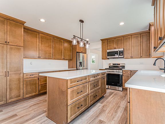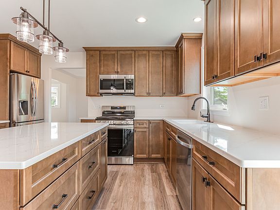 Welcome home to this beautifully remodeled 4-bedroom, 2.1-bathroom residence that blends modern elegance with functional living spaces. From the moment you step inside, the two-story foyer with its stunning staircase sets the tone for the fresh. Off the foyer, a formal living room welcomes guests, while the dining room flows seamlessly into the brand-new kitchen. The kitchen is a true showpiece, featuring quartz countertops, an oversized island, ceiling-height cabinetry, sizable pantry cabinet, and large single bowl sink with a view overlooking the backyard. Sliding glass doors lead to a brand-new backyard deck overlooking the open yard, perfect for entertaining or relaxing outdoors. The inviting family room, complete with a cozy fireplace, creates the perfect gathering space. A remodeled powder room, large laundry area, and mudroom with direct access to the attached 2-car garage add both convenience and style to the main level. Upstairs, discover four spacious bedrooms and two fully remodeled bathrooms. The primary suite offers a luxurious retreat with a private bath, while both second-floor bathrooms are outfitted with double-sink vanities for added comfort and functionality. The exterior is just as impressive, featuring durable Hardie Board siding and a newly poured concrete driveway that enhance both curb appeal and peace of mind. Every detail has been updated, giving this home a like-new feel while still offering the comfort of an established neighborhood.