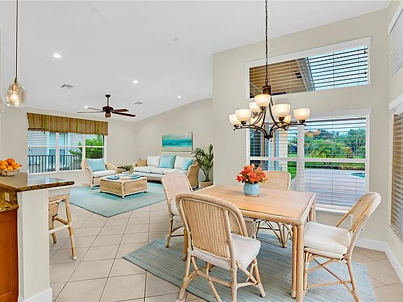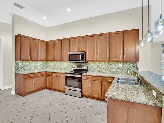 Freshly painted and move-in ready, this 4-bedroom, 3-bathroom, lakefront, pool home with 3-car garage offers both comfort and function. The split-bedroom, open floorplan features volume ceilings, all-tile flooring, granite counters, and stainless steel appliances. A screened patio and oversized pool deck overlook the fenced yard and lake, perfect for entertaining or birdwatching. Located in a gated community with resort amenities including a fitness center, lap pool, pickleball, tennis, basketball, and volleyball. Seller-paid inspection report provides peace of mind.