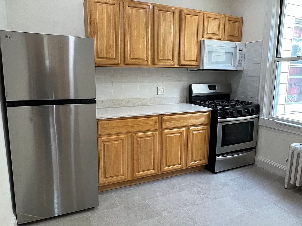 Bright and spacious two-bedroom, one-bathroom apartment featuring gleaming hardwood floors. Enjoy a brand-new kitchen with modern countertops, new appliances, and ample cabinet space. Freshly painted with a clean, updated look ready for move-in!