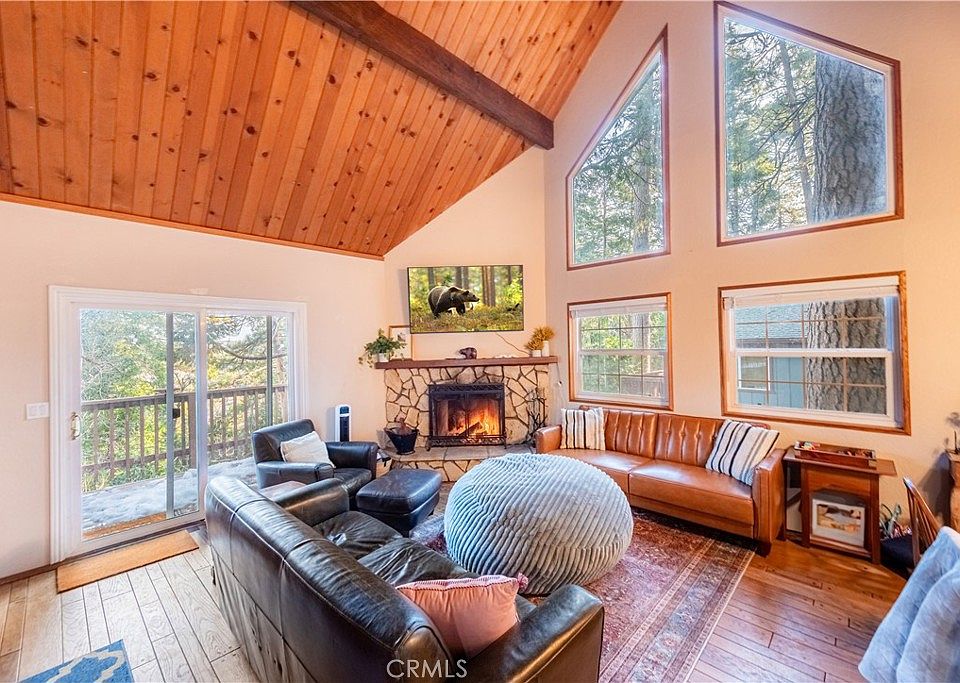 A full turnkey and approved short-term rental perched amidst the towering pines of Crestline, this enchanting three-story mountain home offers four bedrooms and two baths across 1,544 square feet, creating the perfect blend of family living and alpine getaway. Vaulted, cathedral-style ceilings and striking triangular windows fill the open great room with natural light while framing sweeping forest views, an ideal backdrop for cozy evenings by the fireplace or gatherings that flow out to the spacious balcony for dining and fresh mountain air. The open-concept main level features a well-appointed kitchen with granite countertops and stainless steel appliances, seamlessly connected to the dining and living areas for effortless entertaining. Bedrooms are thoughtfully arranged, with a main-level room offering balcony access and a one-and-three-quarter bath, a charming loft bedroom on the third floor with a private balcony and built-in storage, and two additional bedrooms on the lower level alongside a full bath and laundry hookups. Outside, a tiered wooded backyard provides ample space for pets or play, while parking for 3–5 vehicles makes hosting guests a breeze. Just minutes from Lake Gregory and Lake Arrowhead, and under an hour from Big Bear, this inviting retreat offers easy access to hiking, skiing, and year-round outdoor adventures—your perfect mountain sanctuary awaits.