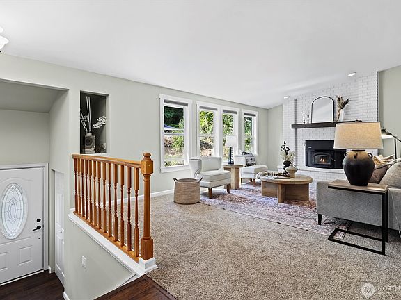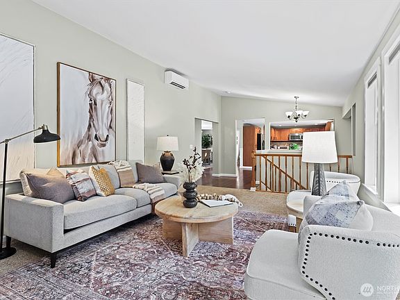 Spacious, fully fenced & gated view home on nearly 1.5 acres, just 30 min to Microsoft & Meta! 3bd/2.75ba w/ dual heat-pump A/C, perched on a quiet dead-end street w/ sweeping views of Snoqualmie Valley, Cascades & Mt. Rainier. Expansive 700 sq. ft. deck, or take in the views from nearly every room. Fresh paint, remodeled lower level w/ new floors, doors, built-ins, cabinets, vanity & laundry sink. Kitchen w/ limestone counters, stainless appliances & full-height backsplash. Primary suite w/ custom closets & 5-pc ensuite. Large rec & flex space, EV charger, sprinklers in front yard.