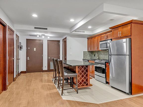 Modern, open kitchen features a large island with a custom built wine rack, stainless steel appliances, including a dishwasher, and beautiful brown hardwood cabinets