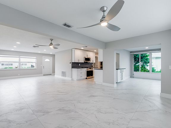 FULLY RENOVATED Edgewood Model highly sought-after 55+ Palm Beach Leisureville. This home has quartz kitchen counters with LG stainless steel appliances, Samsung Washer & Dryer, marble floors, custom closets, recessed lighting, new bathrooms, large Florida room and Lanai. Roof 2022, AC 2019, GE Panel, Impact windows. Paid recreation lease. Maintenance includes exterior painting and power washing of home, lawn care, onsite management. Amenities include 3 heated pools and 3 club houses, hot tub, fitness center, library, game room, corn hole, bocce, BBQ/picnic area. FREE private golf course with pro shop. Many social events, clubs, on-site entertainment and much more. Close to shopping, dining, beaches, seaside recreation and Palm Beach International Airport. Lender Financing Available.
