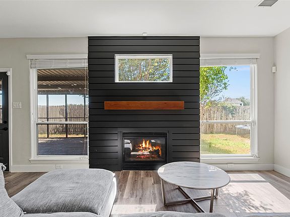 Cozy gas-log fireplaceHome officeDining areaBuilt-in wine rackGranite countertopsCovered patioNew kitchen