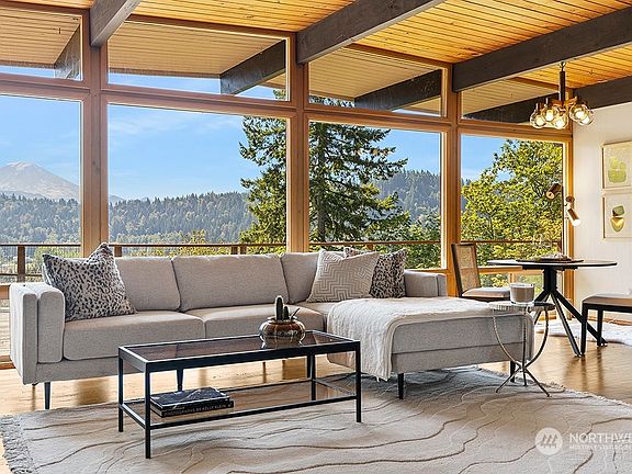 Custom built home inspired by the designs of Frank Lloyd Wright. A true mid-century modern design with a low profile that becomes part of the ridge offers unparalleled, unobstructed Mt Rainer views. Front-row seating to breathtaking beauty. But that's not all - this home also boasts a serene creek & valley view, creating a peaceful & private park-like setting tucked away from the road. The large deck features covered outdoor entertaining area complete w/ fireplace off the kitchen & dining area for year-round entertaining. Inside you'll find large windows & vaulted ceilings. This one-story home features 4 beds & 2 baths w/ main being ADA accessible shower & sink. Tons of parking. First time this special property has been offered on market!