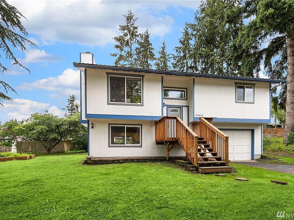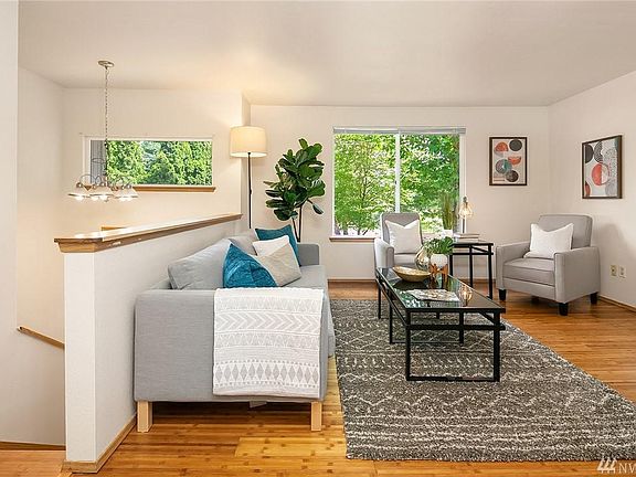 Shelton View Elementary with a great location, quiet cul de sac & garden beds on a large lot! This 3 bedroom, 2 full bath home has many updates and a flexible floor-plan. Currently the downstairs is set as a separate studio apartment with it's own kitchen and full bath. The space would also be a great family room or "work from home" space. The bathrooms are updated with new tile floors, sinks, vanities and lighting. Updated vinyl windows and metal roof mean low maintenance. Northshore Schools!