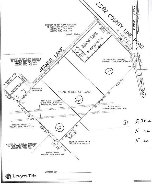 DESIRABLE ACREAGE IN DEVELOPING AREA. LAKE RAY HUBBARD ACROSS TROY RD FROM PROP. 12 IN WATER LINES ON 2 SIDES AND 6 IN ON 3RD SIDE PER EAST FORK WATER SUPPLY. EASILY ACCESSIBLE ON ALL WEATHER RDS TO BUSH FREEWAY, ROCKWALL ROWLETT AND THE CITY OF WYLIE. UNFENCED WITH SCATTERED NATIVE CEDAR TREES. ELEC. POWER LINE CROSSES THE WEST REAR CORNER OF PROP. --GREAT LOCATION FOR DEVELOPEMENT, COMMERCIAL, RESIDENTIAL OR MULTIFAMILY. NEW SUB'D UNDER CONSTRUCTION ACROSS COUNTY LINE RD AND IS IN THE CITY OF WYLIE. PROPERTY CAN BE PURCHASED IN TOTAL OR ANY ONE OF 3 TRACTS AS SHOWN ON SURVEY SHOWN IN PHOTO'S. TRACT 1 @630,120.00, TRACT 2 @ 475,950.00 TRACT 3 @ 425,850.00.