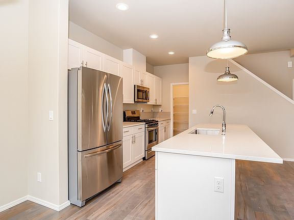 Downstairs has an open floor plan with a spacious kitchen boasting stainless steel appliances and a gas stove, half bathroom, spacious pantry, two car garage, and private patio. Continuing upstairs, you will find a large primary bedroom with a spacious closet and attached bathroom, laundry room with extra storage, and two additional bedrooms with another full bathroom.