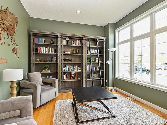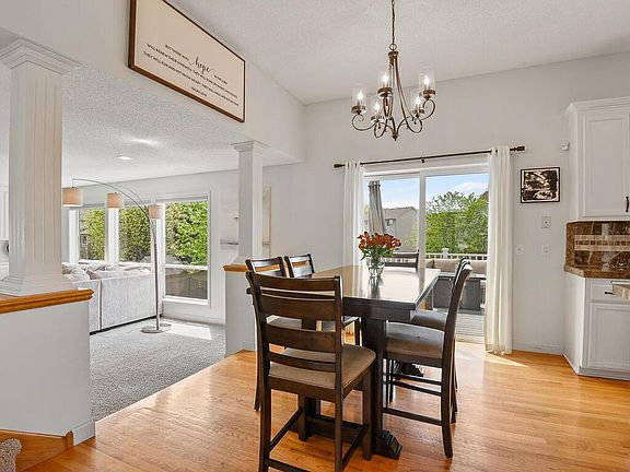 Move-in ready 4 bdrm, 4 bath home has great entertaining and workspaces. Open concept main flr has large LR w/ built-in cabinetry, white cabinetry in kitchen w/ granite tile backsplash and counters as well as hardwood floors and high ceilings throughout kitchen, dining, den and foyer. Main floor office w/French doors and den provide work from home options. This modified two-story home has three bdrms on UL including primary w/ private 4 pc bath and WIC. W/O LL has large family rm w/ stone gas FP, wet bar, three quarter bath w/ tile shower and fourth bdrm. Maintenance-free deck and patio overlook backyard pond view. Heated three stall garage and storage shed. Near local shopping and trails, one block from Pheasant Run Park and 3 blocks from Cloverleaf Park.
