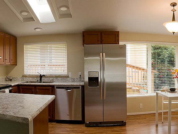 Desirable Green Acres Park. This 3 bedroom home has been beautifully remodeled, has fresh interior & exterior paint, & is move-in ready! A heat pump offers efficiency & air conditioning for year round comfort. Choose from a walk-in shower or tub. Skylights & light filled open floor plan. Nice laundry room. Charming low maintenance Zen garden & the garden seating can stay. Park includes lakes, trails, clubhouse & community activities. Free swimming at McMenamins for Bothell residents.