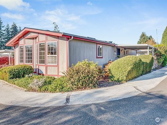 The one everyone is waiting for! Corner lot. New roof in 2016. Move-in ready 2 bedroom in desirable Green Acres 55+ Park. Southern exposure with large windows, sky lights & vaulted ceilings fills the living area with natural light. Cozy electric fireplace. Laminate hardwoods in dining & kitchen. Beautiful hutch & book cases stay with home. New bedroom carpets. Newer appliances. Heat pump/furnace for lower heating bills & air conditioning in the summer. Low maintenance landscaping, covered front porch/deck, spacious hobby shed with loft, and 2-car carport. Entry off front porch has no stairs. Community includes lakes, trails, & clubhouse. Free swimming & live music for Bothell residents at nearby McMenamins. Financing available.