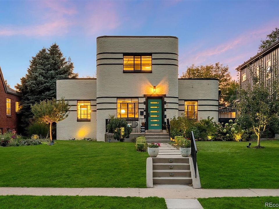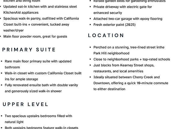 Perched high on a stunning, tree-lined street in Park Hill, this captivating home blends iconic Art Deco design with thoughtful modern updates. Situated on a spacious lot, this home invites with timeless details, a generous backyard, and carefully crafted updates designed for comfort and functionality. The main level features arched entryways and restored original windows that fill the home with an abundance of natural light. Upon entry, the main living area welcomes you with warmth and character, highlighted by a fully functional wood-burning fireplace that serves as a timeless statement piece. A rare main-floor primary suite includes a walk-in closet outfitted with custom California Closet built-ins installed in 2022 along with a fully renovated primary bath with double vanity and custom tile. The updated kitchen features a convenient walk-in pantry with California Closet built-ins, stackable washer/dryer, soft-close cabinetry, quartz countertops, stainless appliances, and a breakfast bar that flows effortlessly to the dining area—ideal for everyday living and entertaining. The well-maintained original hardwood floors extend throughout both levels. A stylish powder room completes the main floor, while two spacious upstairs bedrooms share a fully remodeled bath. The oversized backyard is a true retreat—lushly landscaped and framed by mature aspens for added character and privacy. Thoughtfully designed, it features dedicated spaces for dining and lounging, raised garden beds for the green thumb, and plenty of room to relax and entertain. A private driveway with an electric gate provides four additional parking spots along with enhanced security and convenience, leading directly to a two-car garage finished with epoxy flooring. Located near neighborhood parks, schools, and Kearney Street’s shops and dining. This property offers classic Park Hill character and is truly one of a kind, thoughtfully updated with modern touches for comfort and peace of mind.