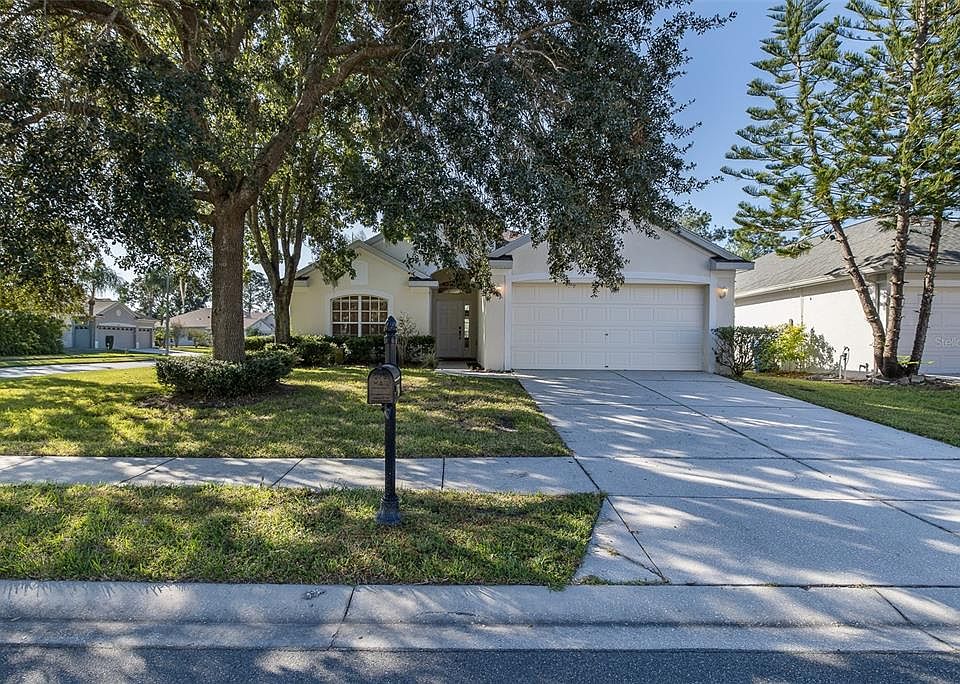 Welcome to this spacious 3-bedroom, 2-bath home plus a den/office featuring 1,758 sq. ft. of living space and a 2-car garage, perfectly situated on a corner lot in the highly sought-after Plantation Palms community. Step inside to discover an inviting open-concept layout that seamlessly connects the kitchen and family room, perfect for both everyday living and entertaining. The kitchen offers a large breakfast bar, eat-in area, and ample counter space, while a separate formal dining room provides a perfect setting for family dinners or special occasions. The primary suite features a walk-in closet and a spacious en-suite bath complete with dual sinks, a garden tub, and a separate shower. Additional highlights include an inside laundry room, screened-in patio, and a large backyard with no rear neighbors, offering serene views of the Plantation Palms Golf Course. Enjoy quiet cul-de-sac living with sidewalks on both sides of the street and no through traffic — ideal for privacy and peace of mind. Located just moments from top-rated schools, shopping, and dining, and within walking distance to the Land O’ Lakes Recreation Complex, featuring an Olympic-size pool, tennis and basketball courts, playground, fitness center, baseball, soccer, and football fields. Conveniently close to Cypress Creek Mall, The Grove, Shops at Wiregrass, and major highways for an easy commute to downtown Tampa, Brandon, St. Pete, and Clearwater.