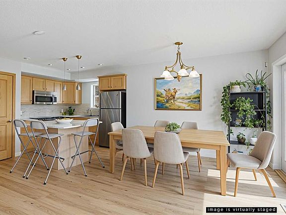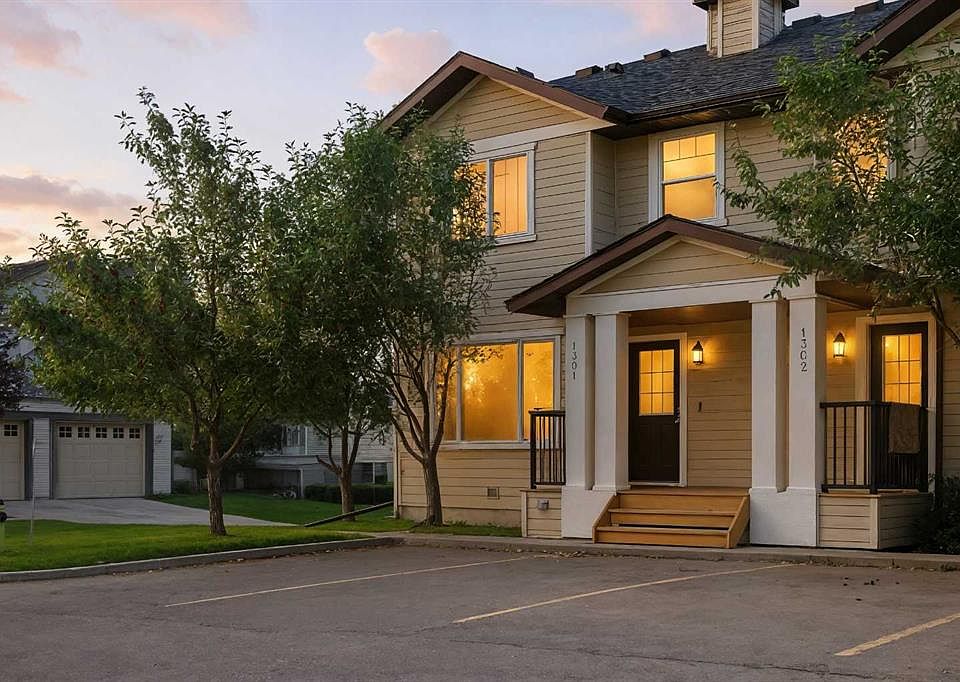 Bright and pristine 3-bedroom, 2.5-bath END UNIT townhome is one of the best in the complex, offering over 1,360 sq. ft. of living space plus 600+ sq. ft. of unfinished basement with incredible potential. The main floor is flooded with natural light and has been freshly updated with brand new vinyl flooring and baseboards, giving it a modern, clean look. The kitchen is a standout, featuring brand new laminate countertops, a large central island with a breakfast bar, shaker-style cabinetry, stainless steel appliances, and stylish pendant lighting, perfect for entertaining and meal prep. Brand new carpet on the staircase and upper floor, along with fresh paint throughout both levels, completes the refreshed look. Upstairs, you'll find 3 bedrooms, including a primary suite with a 4-piece ensuite and large walk-in closet, plus another full bathroom for family or guests. The basement is thoughtfully laid out with a furnace room tucked neatly in the corner, rough-in for a future bathroom, and plenty of space to add 2 more bedrooms, making it a feature-ready space for the new owners. Enjoy indoor and outdoor living with a covered front porch and private semi-fenced sunny backyard patio. Two titledn parking stalls are conveniently located right outside your front door. Set in the welcoming Sagewood community, you'll love the quiet tree-lined streets, nearby parks, pathways, and schools. This home has been thoughtfully updated, meticulously maintained, and is truly move-in ready. Offering amazing value and unbeatable convenience, it’s easy to fall in love with this gem!