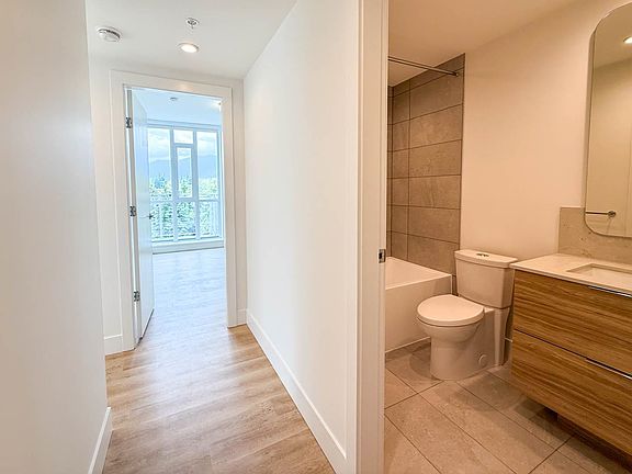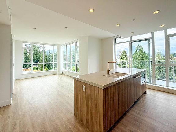 Welcome to the exclusive CLUBHOUSE Tower at Parkside at Lynn. This brand-new, A/C, UNFURNISHED top-floor 2 bdrm and den, 2 bath home was handpicked as the best in the bldg, featuring upgraded finishes, wide-plank h/w flrs, & floor-to-ceiling windows w/ panoramic mountain views. The open-concept layout includes a gourmet kit w/ Bosch appl, 5-burner gas cooktop, panel-front fridge/d/w, quartz island, gold hardware & built-in microwave. The master suite boasts dbl vanity & large walk-in shower. Enjoy access to the Lynn Club w/ fitness studio, indoor pool, lounge & outdoor entertaining space. Located at the edge of Kirkstone Park, steps to Lynn Valley Centre & trails. Rent incl. hot water, gas, 2 u/g parking stalls & storage locker. No pets.