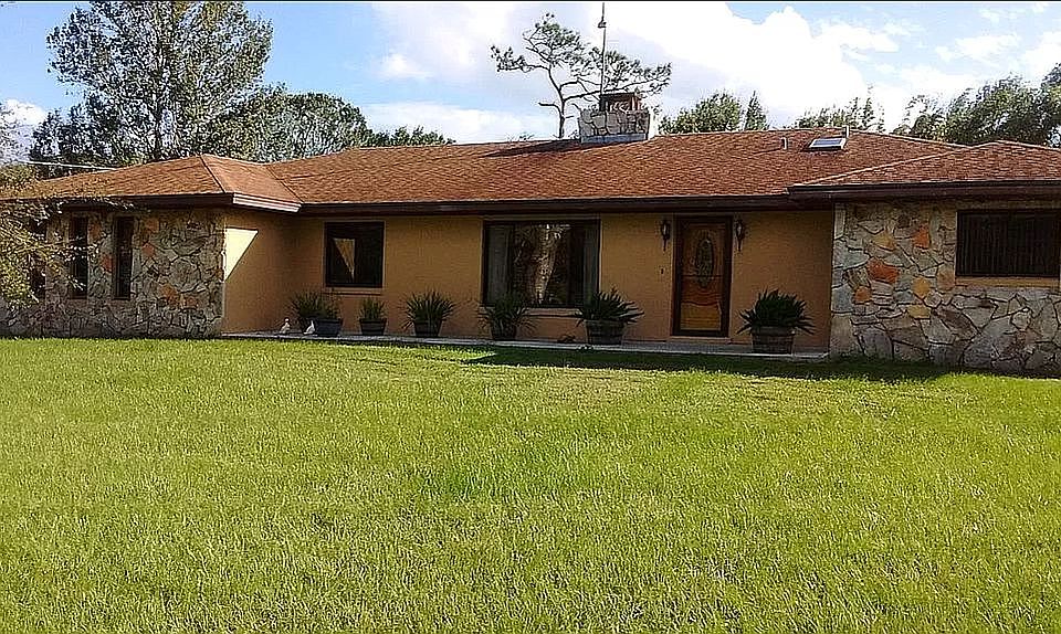 Country living right near town! This spacious custom-built home sits on nearly 5 acres of land. Lots of land, a live fence and many trees ensure shade, privacy and serenity throughout. NO HOA! The house has four bedrooms, 2 master bedrooms with en-suite bathrooms, and an extra fifth room which currently serves as a playroom. The living room features a natural stone fireplace. The Florida room is finished in beautiful custom wood panelling. The property has a large attached garage, as well as a workshop/shed/carport combo. Land can be used for pasture, farm, nursery, playground, or other projects. Zoning also allows building a second smaller unit on the property, or potentially subdividing the lot into two smaller lots