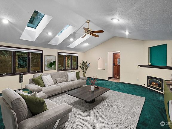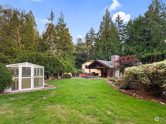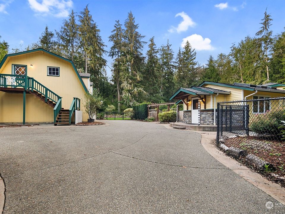 Stunning contemporary home with a lodge-style design offers absolute privacy at the end of a serene, tree-lined road. This gardener's paradise sits on over an acre, complete with a greenhouse, gated raised beds, water feature, and fruit trees all within an award winning school district. Enjoy the tranquil hot tub, shed, dog run, and chicken coop. The property also includes a detached two-car garage with a shop, loft/studio with ADU/MIL potential, heat pump, fully enclosed fencing, generator, and 45 years left on the recently replaced roof! The open-concept layout features an spacious kitchen, indoor and outdoor fireplace, and primary bedroom that opens onto a wraparound deck!