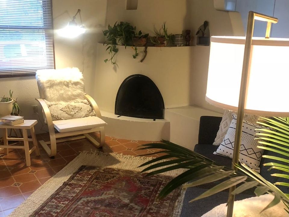 Wood-burning kiva fireplaceExtra built in shelvesTwo bathroomsLarge walk-in closetPlenty of cabinet spaceRustic wood ceilingGround level unit