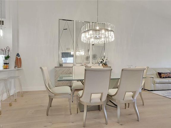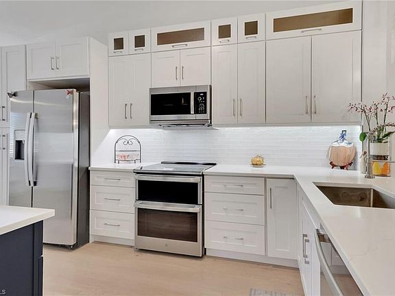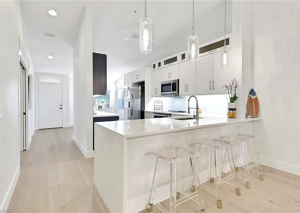 Discover this beautifully renovated & reimagined 3-bedroom, 2-bath condominium in Falling Waters featuring one of the largest saltwater pools in Naples. This modern end-unit residence includes a detached garage with custom cabinetry for additional storage and has been thoughtfully redesigned to balance functionality and elegance. The home showcases rich engineered wood flooring, crisp new baseboards, and detailed casement moldings that define each space with architectural precision. The reimagined kitchen offers expanded custom cabinetry, quartz waterfall countertops, pendant lighting, stunning new chandeliers, and GE Profile appliances, all designed for beauty and efficiency. Both bathrooms were completely redesigned with designer tile work, new toilets, dual quartz vanities, LED mirrors, and seamless glass shower doors. The primary suite is a true retreat, highlighted by ocean-inspired tile, a double-sink quartz vanity, new pocket doors, and sophisticated brushed-gold finishes. Natural light fills the living spaces, enhanced by new recessed lighting and direct-drive ceiling fans with integrated lights. Every closet has been upgraded with cedar shelving, and the entire interior has been freshly repainted. The lanai extends the home’s living space with upgraded lighting, an under-counter GE refrigerator, and a built-in BBQ, ready for relaxing or entertaining. Falling Waters offers an impressive array of amenities, including a sprawling saltwater lagoon-style pool surrounded by waterfalls and tropical landscaping, a beautifully updated clubhouse, tennis and bocce courts, putting green and a vibrant social calendar. The community’s lush setting and resort atmosphere create an unmatched Naples lifestyle experience. Falling Waters is ideally located just minutes from Downtown Naples, Tin City, and 5th Avenue South. Surrounded by new development and planned expansion, this area continues to grow in appeal and long-term value. Modern, functional, and ideally located—this is one of the finest residences in Falling Waters.