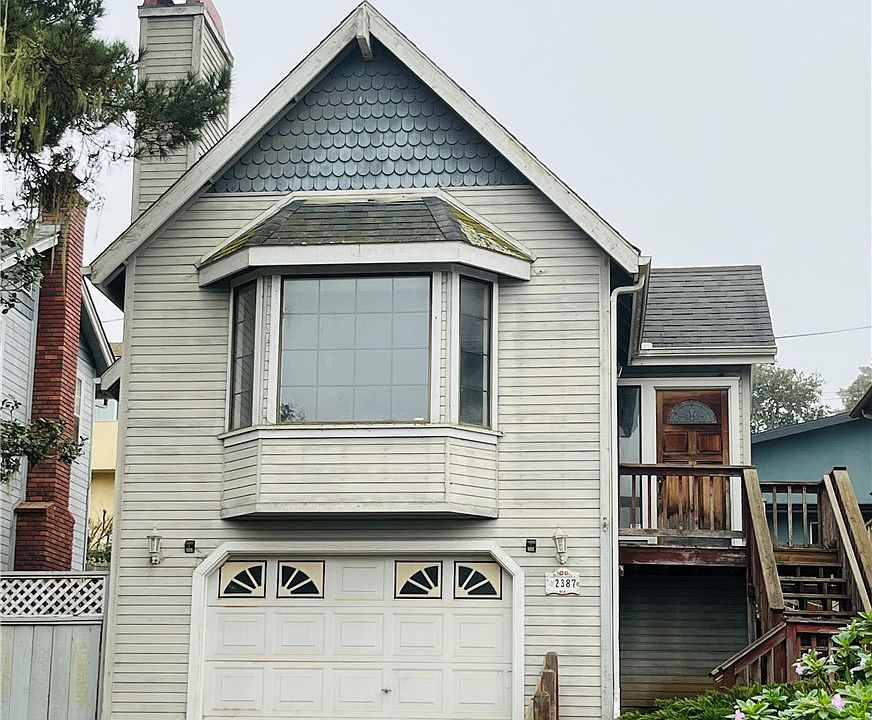 Potential for a cute Cambria Cottage, near the Fern Canyon Trailhead on a dirt road with a dedicated garden across the street, where the Cambria turkeys have afternoon tea. This home has been neglected for the past several years and will need more than TLC to bring it back to it's full potential to be a West Coast free-standing 'row house'. The primary bedroom is downstairs with French doors opening to a private balcony with steps to the garden, it is across the hall from a full en suite bathroom. Kitchen has oak cabinets, tile counter tops, dining room with sliding door to the side deck and garden. Large living room with fireplace and 20 foot vaulted ceiling. Upstairs is a room that was used as a second bedroom (no closet) also with beamed ceiling, half bath, washer and dryer hook-ups are also upstairs. Call your Realtor today, for more information.