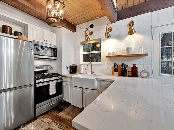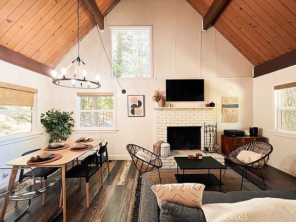 Welcome to your home nestled between Lake Arrowhead and Big Bear Lake! This updated, charming cabin is what dreams are made of! 2 beds, 1 bath, 660 SF home of rustic chic and modern living is ready for you! The home is open concept with a high ceiling and gorgeous beams that perfectly frame the home. The plentiful windows let in an abundance of light and makes it feel like you are in a treehouse! In the main level, you’ll find a spacious living room with fireplace perfect for entertainment and immediately next to it, a formal dining area with a large modern chandelier and seating that fits six. The updated kitchen has stainless steel appliances, a white farmhouse sink, white cabinets, a cute black chandelier, new white subway tiles, and a quartz countertop. The bathroom, also on the main living floor, has a vanity with quartz countertop, tile flooring, a bathtub and shower combination, and light fixtures including a rustic glass like chandelier. The main floor bedroom is immediately next to the kitchen and bathroom. Upstairs you’ll find an attic like bedroom that is comfy and cozy. Outside and down the stairs in the front of the home, you’ll find a large deck with beautiful forest views and on the back side of the home, you will find a small sitting area that gives you privacy while enjoying the forest views. Ideally located on the mountain - only 5 miles away from Snow Valley Ski Resort and 15 minutes from dining, shopping, and events at Lake Arrowhead Village. Whether you are looking for a new home, a home away from home, or an income producing property, this home has it all and is ready for move-in. This property is definitely one you do not want to miss.