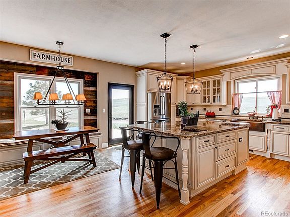 You will love this gorgeous home in highly sought after Franktown! The house has an open floor plan and a Country Farmhouse feel. This 2 level home is not your average. The layout is spectacular, the characteristics from each design detail tie the home together for a fabulous place to entertain. There is beautiful wood flooring throughout the whole home. Stainless appliances (including a built in drawer microwave) stay in the updated, eat-in kitchen with tile back splash, granite countertops, and beautiful cream cabinetry with soft close drawers. There is even a cabinet wired for a TV! Upstairs you will find 3 bedrooms and a bonus room that could be a kids play room, craft room, game room, or a guys get away. All bathrooms have been updated, and the full bathrooms have heated floors! The full walk-out basement is a blank slate ready to be finished to suit. House features new flooring, new lighting, new plumbing fixtures, new paint and so much more. Easy access to Parker, Castle Rock, Elizabeth, and Colorado Springs. It is very rare to find a home like this with 5 acres. Pride in ownership at its best! Truly move-in ready! Don't miss this one!