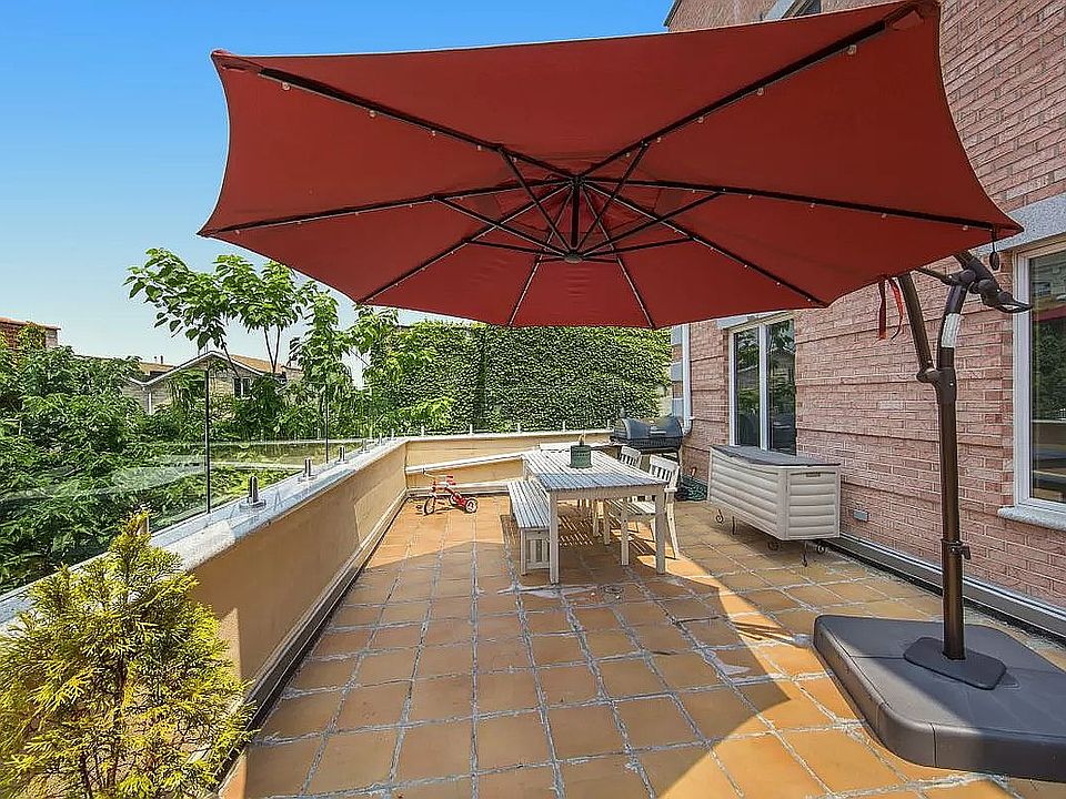 This top-floor unit boasts 4 bedrooms, 2 full bathrooms, and three terraces, including a particularly large one, offering a tranquil outdoor space in the city.