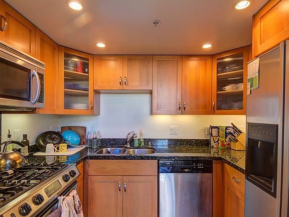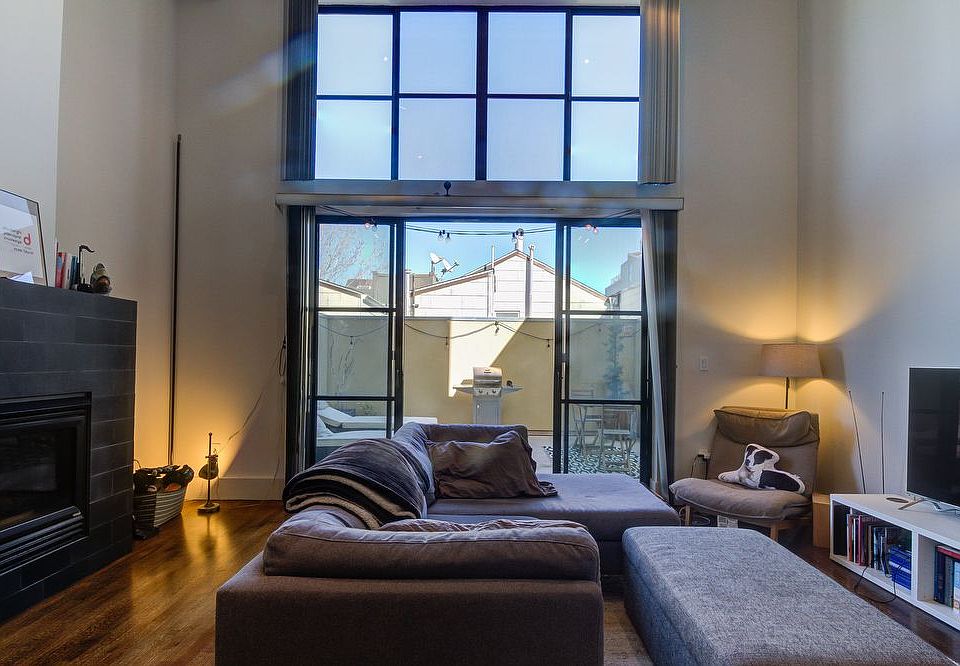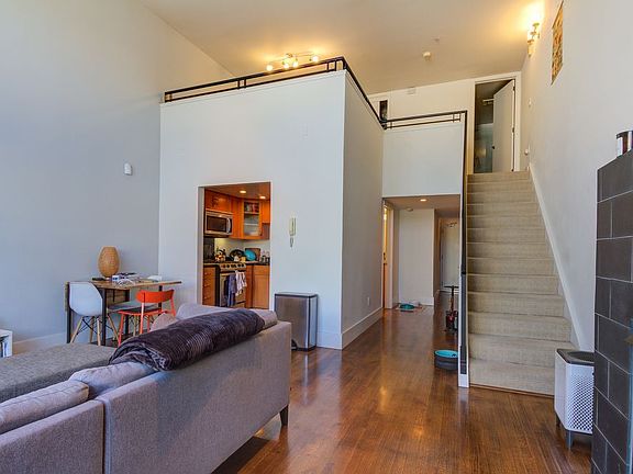 Meticulous modern design, 1 bedroom, 2 bath, SOMA condominium, 799 square feet. Soaring cathedral ceilings allow light to flood this unit, laundry in unit, gas fireplace, forced air heating, central cooling, elevator, Webpass hi-speed internet included, plus common rooftop terrace, one car parking included. Exclusive balcony/terrace enclosed for privacy with BBQ and outdoor furniture. Laundry locker in building, secured bicycle storage room in garage. Loft-style master bedroom en suite with bath. Spacious living room has gas fireplace. Kitchen and baths have granite counter tops. Kitchen has stainless steel appliances, over size gas stove, Bosch dishwasher, microwave. Hardwood floors. Track and indirect lighting. Commute to Downtown San Francisco. 5 minute walk to Civic Center Bart and Silicon Valley buses, 12 minute bicycle ride to downtown SF, 10 minute bicycle ride to Caltrain. Short walk to Trader Joe's, Vive la Tart Bakery, Sightglass Coffee, City Beer Terroir Wine Bar, etc. Security Deposit: $3800 Short term lease available Water, Trash, Recycling and WiFi included Walk score 97/100