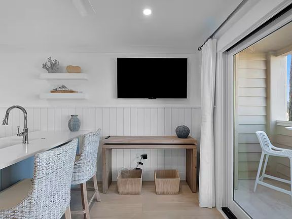 The Space features a full kitchen; in-unit washer and dryer; custom shower, 1 Queen Bed in a private room; 2 twin bunkbeds in a cozy alcove, 2 smart TVs, beach chairs and beach towels provided. This is truly one of the best accommodations you will find on Hilton Head Island for romantic getaways, golf retreats, or family beach vacations.