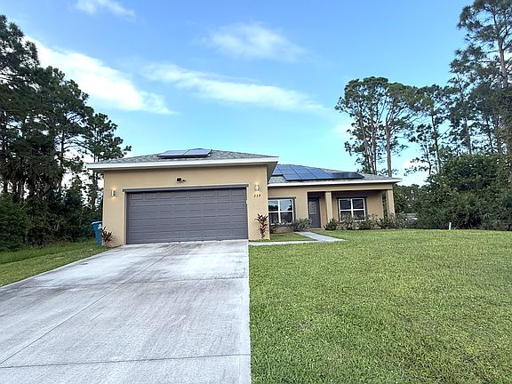 Stunning Nearly New 3BR/2BA, 2 Car Garage with city water. This home offers a blend of modern comfort and serene living. Step inside to discover an open split floor plan, accentuated by lots of natural light and high vaulted ceilings. Tiled floors in all main areas and Vinyl in bedrooms. No carpet. The kitchen features white cabinets, granite countertops, newer S.S. appliances, glass backsplash, and ample storage space. Oversized island with sleek lighting, breakfast bar, and pantry. The primary bedroom offers a peaceful retreat with large window & a walk-in closet. En-suite bathroom offers a glass-enclosed walk- in shower, dual vanities & granite tops. Two Secondary bedrooms are generously sized, with full guest bath featuring tiled shower/tub combos. Inside laundry room with washer and dryer. Two car garage. Enjoy outdoor living in a fenced in backyard oasis, overlooking the canal and Florida wild life. Screened trussed porch ideal for entertaining or unwinding after a long day. House is powered w/Solar Panels providing low cost electric bills. Convenient location, near schools, great shopping, restaurants and the beach. Easy access to major roadways only add to the charm of this home. Rent includes lawn care. Owner will consider Small pets. Available now.