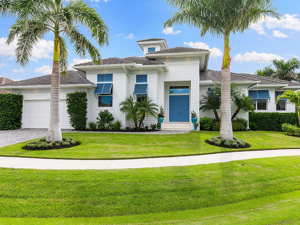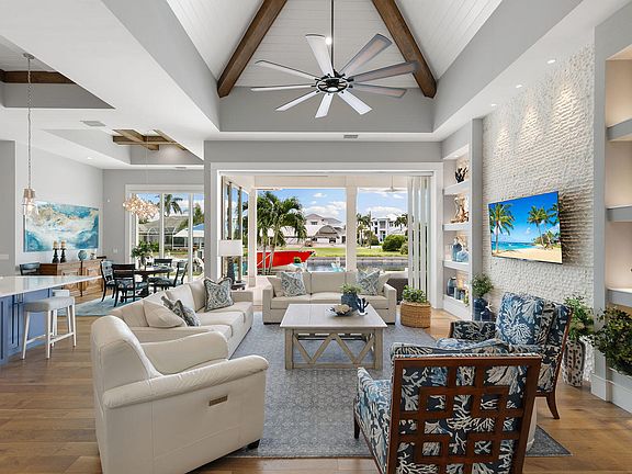 Experience effortless single-story living in this impeccably constructed 2020 waterfront residence, ideally located in the heart of Marco Island. Designed for modern luxury and built to an exacting standard, this four-bedroom, three-bath home is situated on an oversized lot with southeast rear exposure. It is just moments from waterfront dining, boutique shopping and the island's farmers market. A cohesive interior showcases white oak wood flooring throughout, solid core doors, high ceilings and Italian tile in all baths. The open kitchen is thoughtfully equipped with a GE Monogram appliance suite, including the dual fuel gas range, hood, refrigerator and dishwasher, complemented by a Bosch microwave, quartz countertops, walk-in pantry and dual sinks. The living room features volume ceilings, wood beams, custom millwork and a wine bar with Whirlpool wine refrigerator. Ten-foot impact glass sliders throughout the home enhance natural light and create seamless indoor-outdoor flow. A dining area with corner sliders expands the sense of openness. A versatile fourth bedroom functions as a den, complementing a floor plan designed for both privacy and flexibility. Smart home systems elevate the lifestyle experience with a Honeywell Wi-Fi thermostat, Nest doorbell, custom Lutron lighting and motorized Hunter Douglas blinds, all fully compatible with Google Assistant. A full security system with four cameras, app-based controls and integrated automation underscores the home's thoughtful engineering and user-friendly design. The garage includes a custom wall-mounted storage system and motorized ceiling storage, reflecting the same attention to detail found throughout the home. An expansive covered lanai with an outdoor kitchen sets the stage for year-round entertaining, enhanced by a mosquito misting system, Aqualink-controlled pool and spa, and Rainbird-managed landscape irrigation. With a 2008 seawall, the property includes a private dock equipped with a 16,000-pound boat lift, 4,500-pound platform lift and custom Lutron-controlled lighting, offering a complete waterfront lifestyle for boating enthusiasts. Why wait to build when this 2020 residence offers the refined finishes, intelligent systems and craftsmanship typically found in far larger estate homes? Move-in ready and meticulously maintained, it presents a rare opportunity to enjoy luxury waterfront living without compromise.