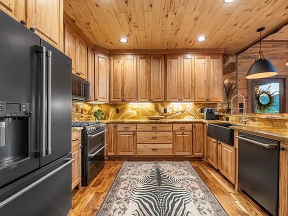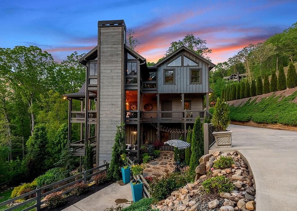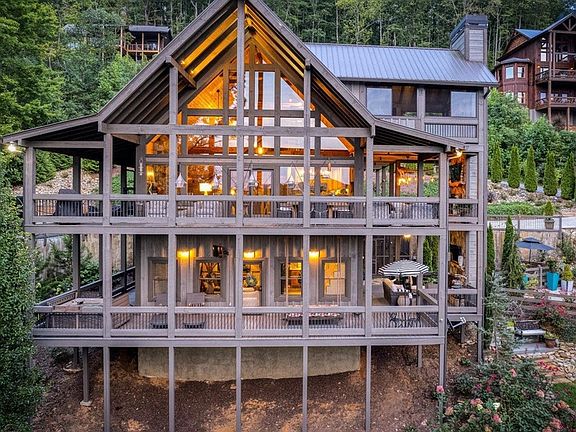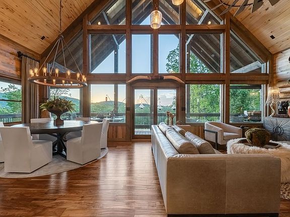 Welcome to an incredible Kevin Teague home boasting unparalleled features and breathtaking views of the mountains from every floor. Located in the premier gated community "The Heights at Cashes Valley", this is the perfect retreat nestled against the National Forest. This property offers privacy and tranquility, making it an ideal personal sanctuary or lucrative short-term rental investment. This property boasts 5 fireplaces, quartz countertops, and Sonos speakers throughout. Retreat to the lavish master suite featuring its own fireplace and a charming three-season room, providing a refuge of relaxation and comfort. Utilize the office loft for remote work with high speed internet access. The living room has 22 foot ceilings with a wall of glass with long range mountain vistas that expands to an 18 foot wrap around covered deck with a dining area for the ultimate outdoor entertaining that will accommodate large groups Soak in a 6 person jetted hot tub under the stars or enjoy leisurely lounging on a swinging outdoor bed located on one of the 3 covered decks. Escape to the fenced oasis of greenery and a private pebbled courtyard that is great for a family game of cornhole or an intimate dining retreat. Arrive in style and convenience with the expansive concrete driveways and parking area, accommodating up to 10 cars with ease. Admire the attention to detail with custom shutters and benefit from the freshly stained exterior completed in 2023. There is ample space to build a garage with living quarters for guest suite, art studio or craft area. Immerse yourself in the best of Blue Ridge outdoors, with close proximity to hiking trails, fishing spots, and the pristine waters of Lake Blue Ridge. Experience the epitome of luxury living and outdoor adventure in this remarkable mountain retreat. Don't miss the opportunity to call this exquisite property your own. Some furnishings available on a separate bill of sale.